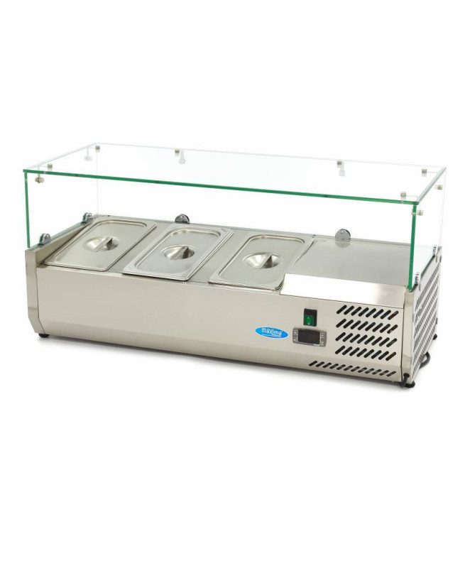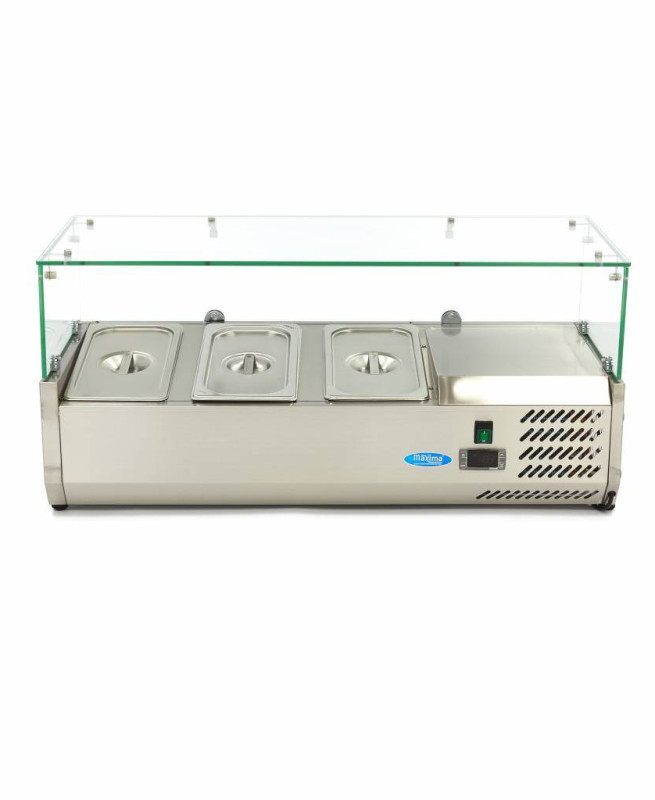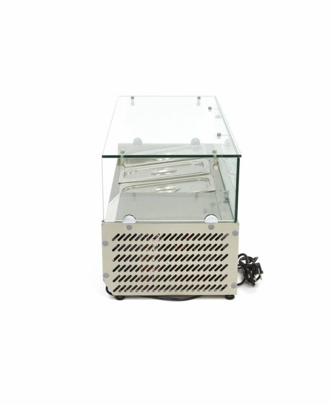 Πολυτελή ψυχώμενη βιτρίνα set up με ορθογώνιο γυαλί. Θήκη και υποστηρίγματα από ανοξείδωτο χάλυβα. Χωρητικότητα 3 x 1/3 GN. Ψηφιακός ελεγκτής θερμοκρασίας. Τοποθετημένο με ρυθμιζόμενα πόδια. Τυπικοί αποκλειστικοί κάδοι και καπάκια
