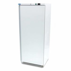 Μεγάλο επαγγελματικό ψυγείο 600 λίτρων με λευκό μεταλλικό εξωτερικό περίβλημα, κλειδαριά και τέσσερα ρυθμιζόμενα ράφια. Ψηφιακός έλεγχος θερμοκρασίας.