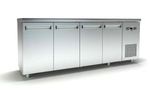 Επαγγελματικό ψυγείο πάγκος με εσωτερικό σχεδιασμένο με υγειονομικές γωνίες στον πάτο του ψυγείου. Πόρτες εφοδιασμένες με μεντεσέδες επαναφοράς και μαγνητικά λάστιχα που αντικαθίστανται εύκολα.