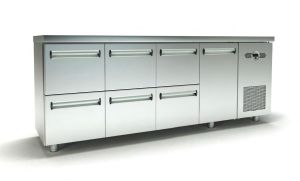Επαγγελματικό ψυγείο πάγκος με εσωτερικό σχεδιασμένο με υγειονομικές γωνίες στον πάτο του ψυγείου. Πόρτες εφοδιασμένες με μεντεσέδες επαναφοράς και μαγνητικά λάστιχα που αντικαθίστανται εύκολα.