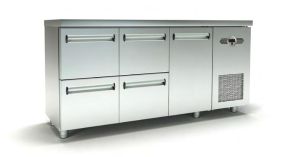 Επαγγελματικό ψυγείο πάγκος με εσωτερικό σχεδιασμένο με υγειονομικές γωνίες στον πάτο του ψυγείου. Πόρτες εφοδιασμένες με μεντεσέδες επαναφοράς και μαγνητικά λάστιχα που αντικαθίστανται εύκολα.