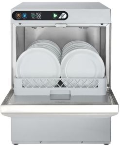 Πλυντήριο πιάτων καλάθι 50×50 cm με κουμπιά ελέγχου LED, πολλαπλούς κύκλους πλύσης και μονή μονωμένη δομή. Εύκολο στη χρήση και συντήρηση με στιβαρή δίμονη πόρτα. Δυνατότητα πλύσης μεγάλου όγκου κάθε είδους πιάτων, ποτηριών, μαχαιροπίρουνων ύψους έως 34 εκ. Αυτό το μηχάνημα είναι κατάλληλο για μπαρ, εστιατόρια και ξενοδοχεία με χαμηλό κόστος κατανάλωσης νερού και ενέργειας.