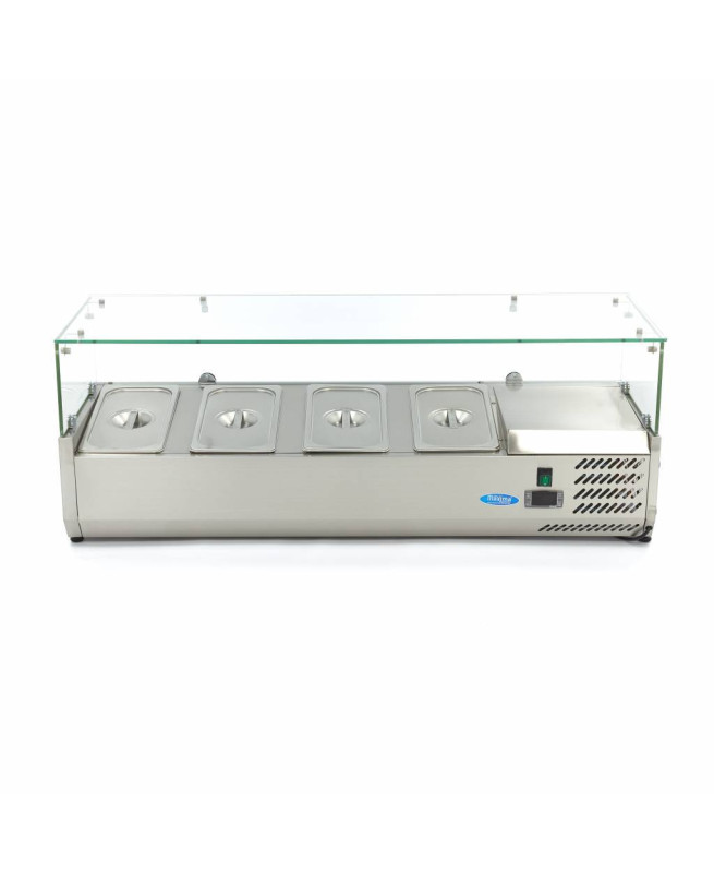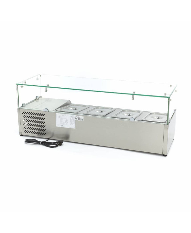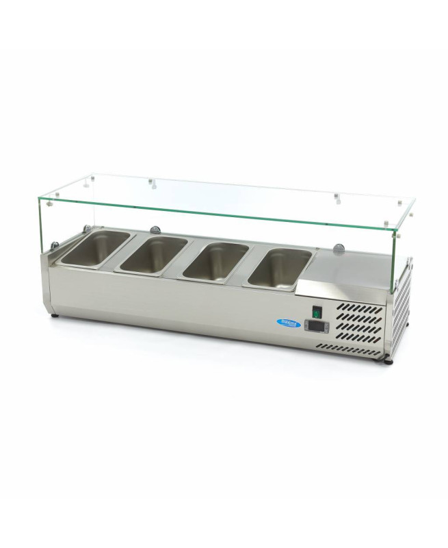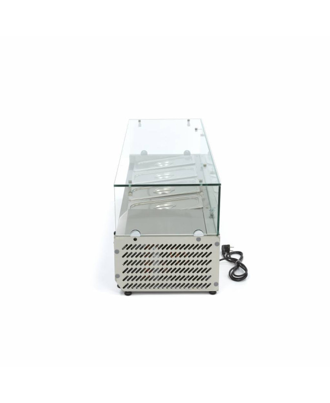 Πολυτελή ψυχώμενη βιτρίνα με ορθογώνιο γυαλί. Θήκη και υποστηρίγματα από ανοξείδωτο χάλυβα. Χωρητικότητα 4 x 1/3 GN ή 3 x 1/3 + 1/2 GN. Ψηφιακός ελεγκτής θερμοκρασίας. Τοποθετημένο με ρυθμιζόμενα πόδια. Τυπικοί αποκλειστικοί κάδοι και καπάκια